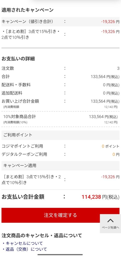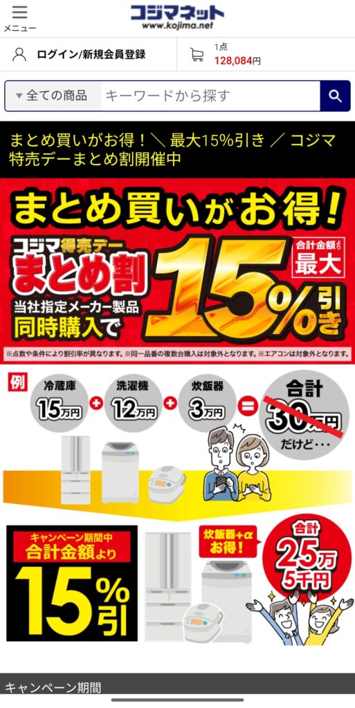 この日、コジマネットではまとめ買いキャンペーンを実施しており、AQUAの洗濯機も対象になっていました。なんと、合計金額から最大15%引き!10万円を超える洗濯機ですから、これは大きなチャンスです。