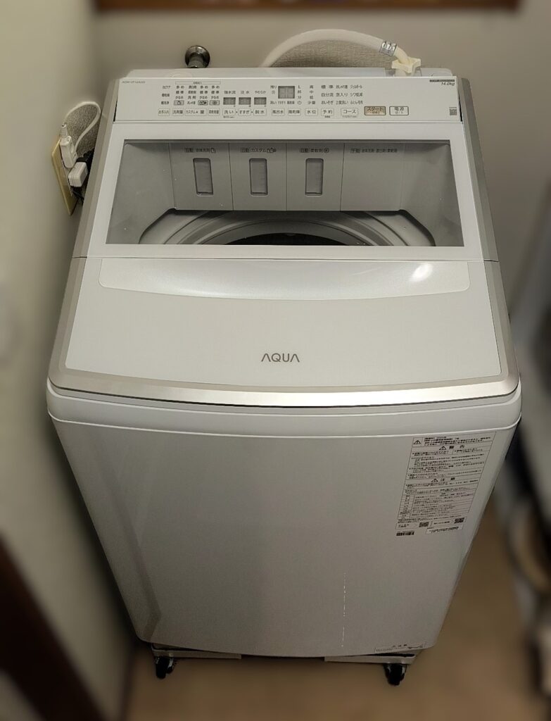 AQUAの縦型洗濯機、AQW-VP14A-Wは、デザインも脱衣所に馴染んでいて、今のところ非の打ち所がありません。