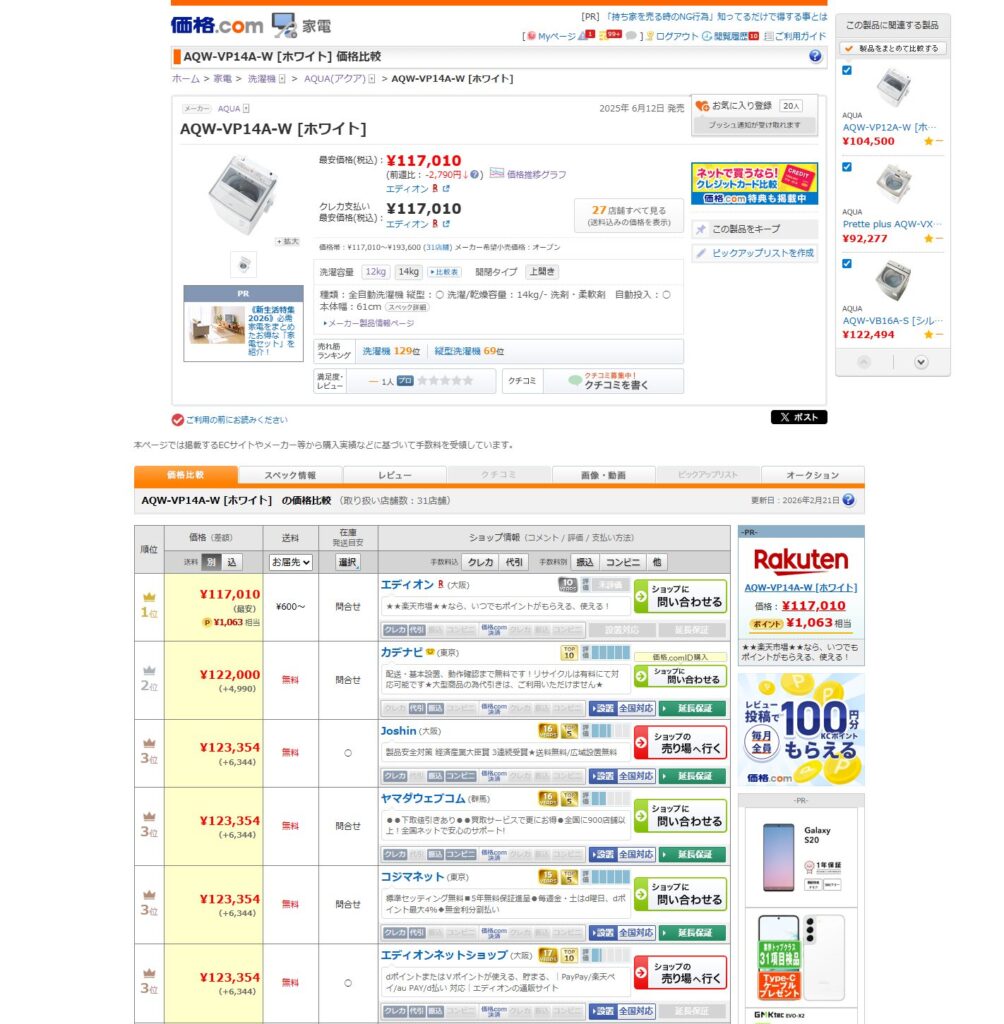 2月の3連休。そろそろ洗濯機も底値になる時期ということで、価格.comをウォッチしていました。